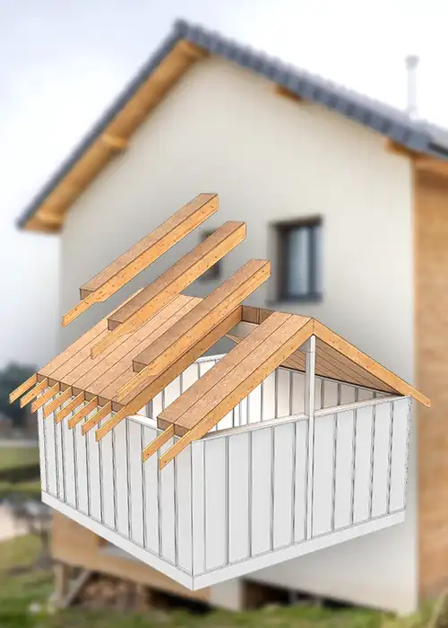 CELENO est un système de caisson de toiture chevronné préfabriqué en bois et isolé en paille, conçu pour répondre aux exigences actuelles en matière de performance thermique, de rapidité de pose et de confort d’usage.